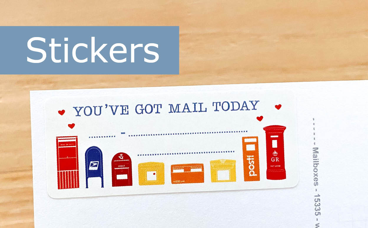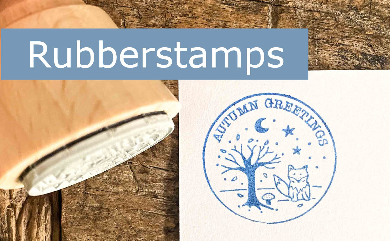 Postcards and rubberstamps with wooden handles, locally produced in Germany.