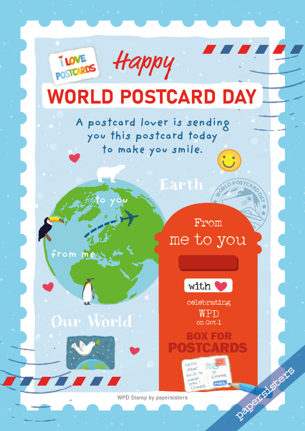 We have designed this postcard with great pleasure for all postcard lovers in the world no matter where they are. It is part of the international “WPD Stamp Series” and is perfect for sending a little love and compassion for World Postcard Day. Also great for collecting and swapping.