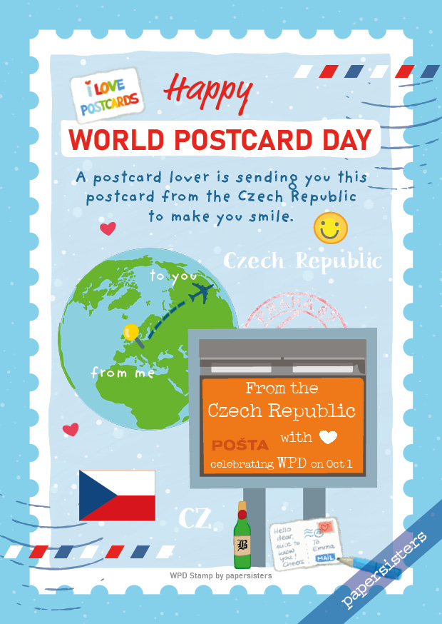 We have designed this postcard with great pleasure for all postcard lovers in the Czech Republic. It is part of the international “WPD Stamp Series” and is perfect for sending a little love and compassion for World Postcard Day. Also great for collecting and swapping.