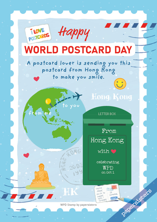 We have designed this postcard with great pleasure for all postcard lovers in Hongkong. It is part of the international “WPD Stamp Series” and is perfect for sending a little love and compassion for World Postcard Day. Also great for collecting and swapping.