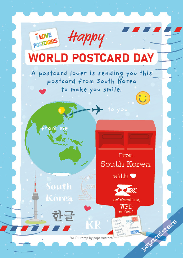 We have designed this postcard with great pleasure for all postcard lovers in South Korea. It is part of the international “WPD Stamp Series” and is perfect for sending a little love and compassion for World Postcard Day. Also great for collecting and swapping.