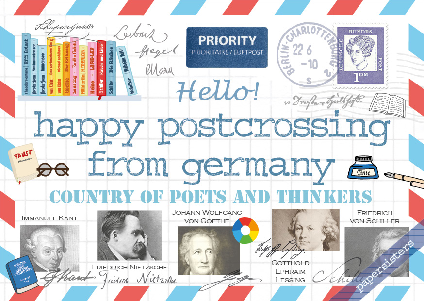 Die Reise durch Deutschland geht weiter - auf der 8. HPC DE Version stehen die Dichter und Denker des Landes im Mittelpunkt - zumindest eine kleine Auswahl. Perfekt um Deutschland in der Welt von Postcrossing zu repräsentieren.