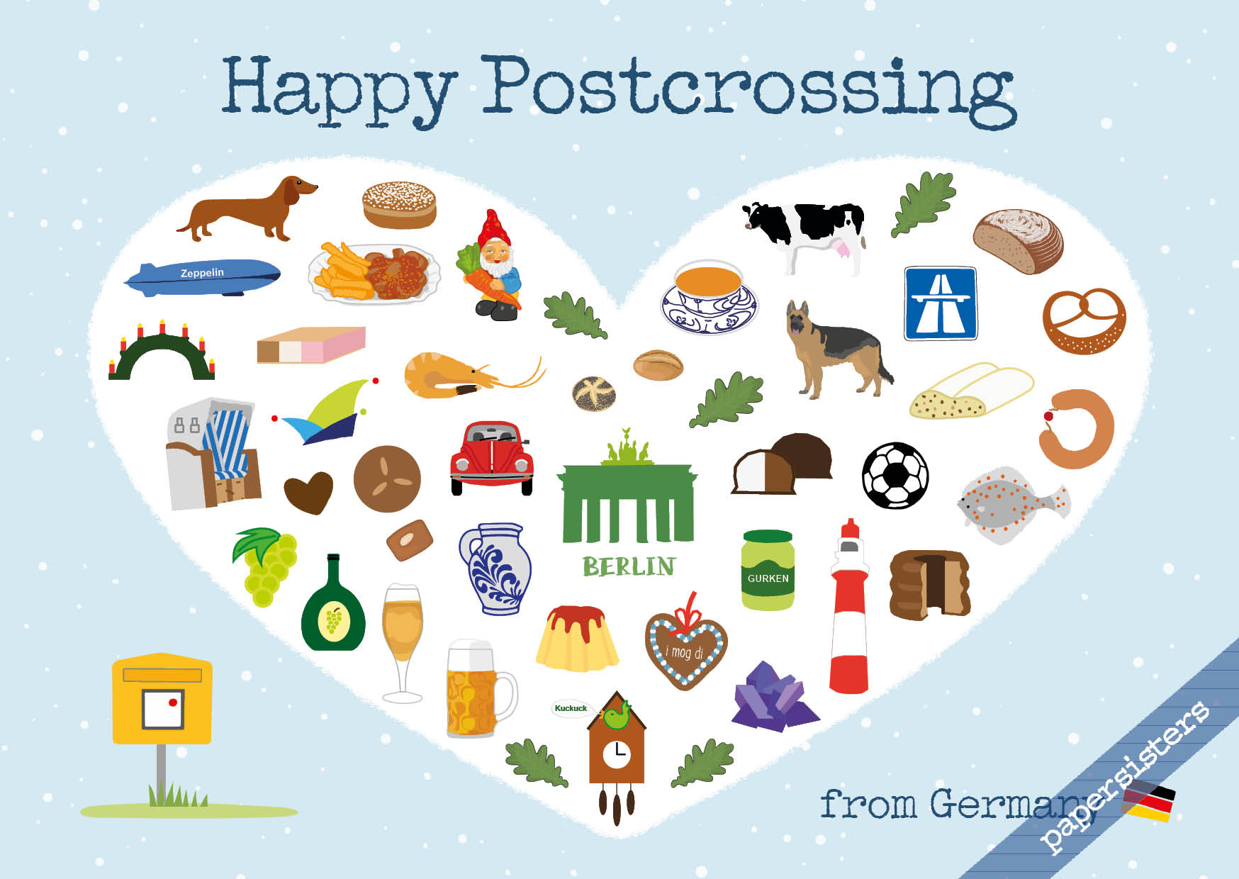Von Deutschland aus schicken Menschen Monat für Monat Tausende von Postkarten in alle Welt. Postcrossing verbindet postalisch Menschen unterschiedlicher Kulturen und Ansichten. Wir haben auf dieser Karte einige Dinge versammelt, die sinnbildlich für Deutschland stehen können. Was fällt Dir noch dazu ein? Teile es doch einfach dem Empfänger im Text mit!