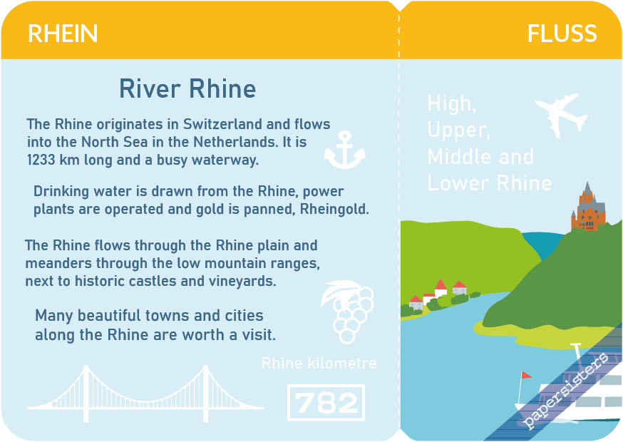 Durch 3 Länder fließt der Rhein auf seinen 1233 Kilometern Länge. An Burgen und Schlössern und Weinbergen vorbei geht es. Viele Orte und Städte entlang des Rheins laden zum Besuch ein.