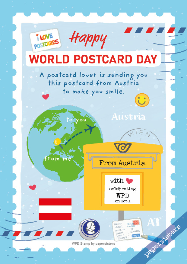 Für alle Freunde der Postkarte in Österreich haben wir mit viel Freude dieses Design entworfen. Es ist Teil der internationalen "WPD Stamp Serie" und perfekt geeignet, um zum World Postcard Day Freude zu verschicken. Großartig auch zum Sammeln und Tauschen.