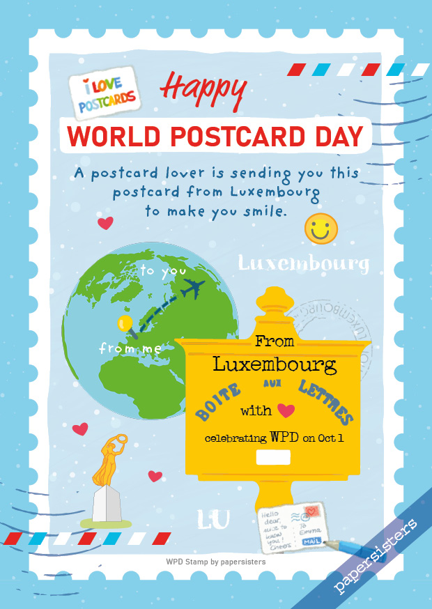 Für alle Freunde der Postkarte in Luxemburg haben wir mit viel Freude dieses Design entworfen. Es ist Teil der internationalen "WPD Stamp Serie" und perfekt geeignet, um zum World Postcard Day Freude zu verschicken. Großartig auch zum Sammeln und Tauschen.