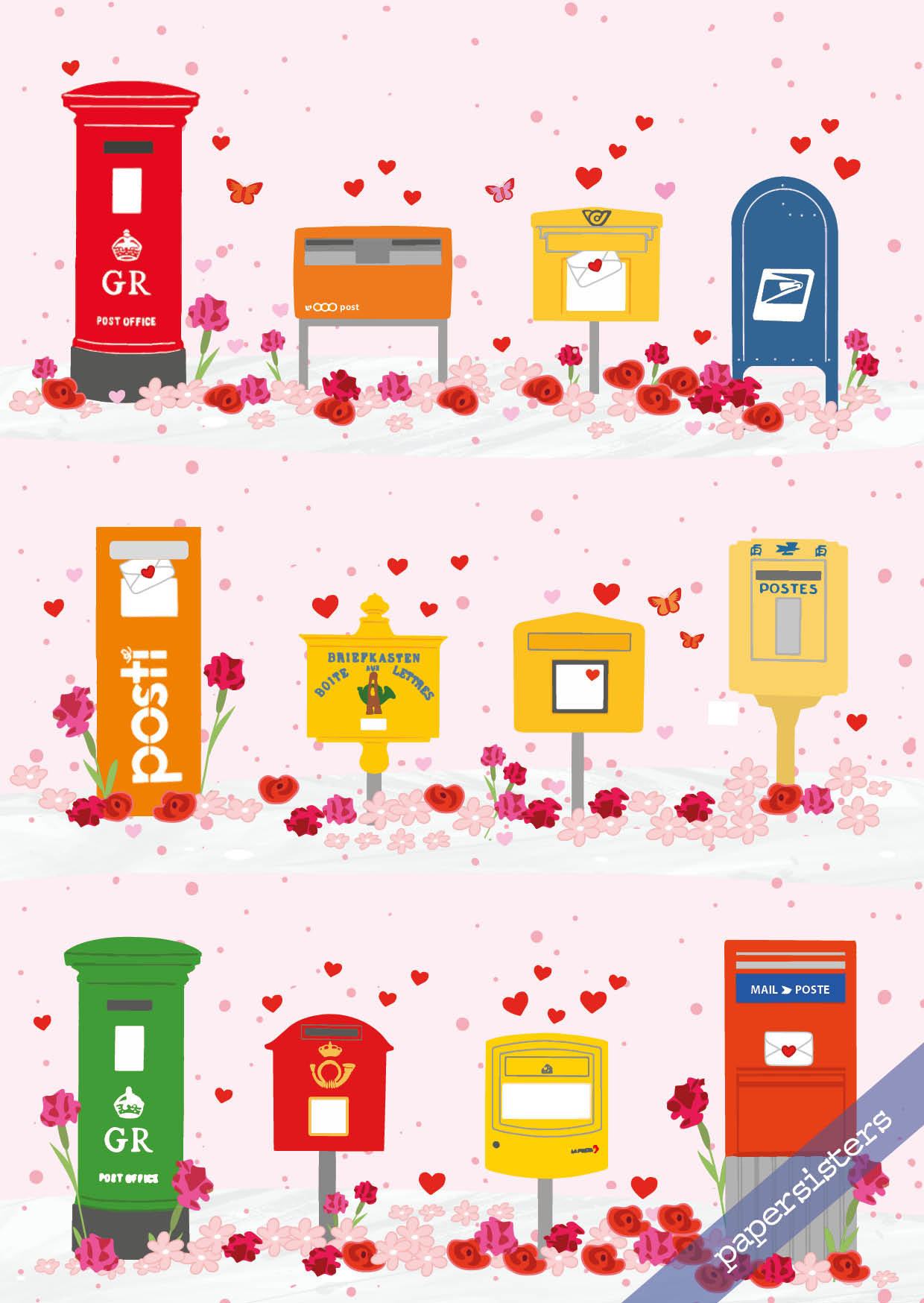 Bunte Briefkästen aus aller Welt in einer rosa Traumwelt aus Blume, Herzen und Schmetterlingen. Für diejenigen Menschen, die unser Herz berühren. Ob als Valentinskarte oder das ganze Jahr über - diese Postkarte wird gut ankommen!