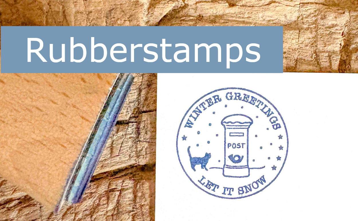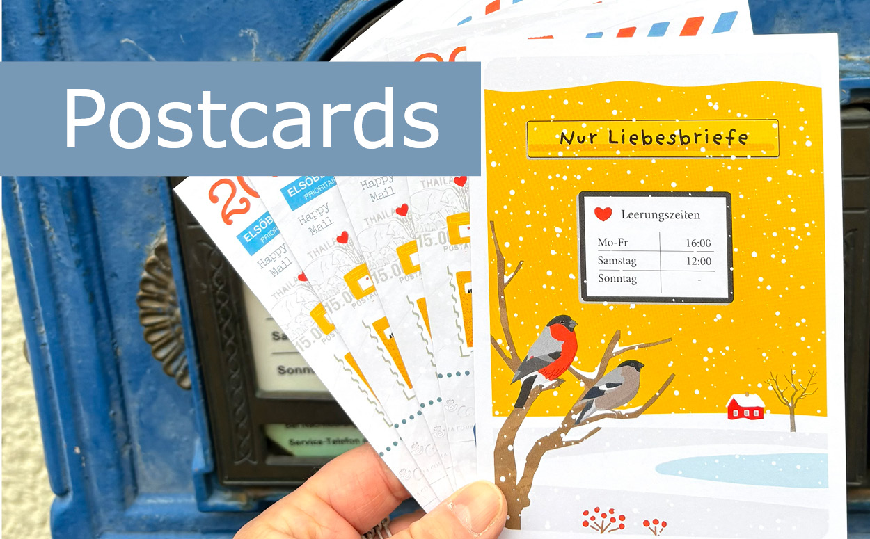 Postcards and rubberstamps with wooden handles, locally produced in Germany.