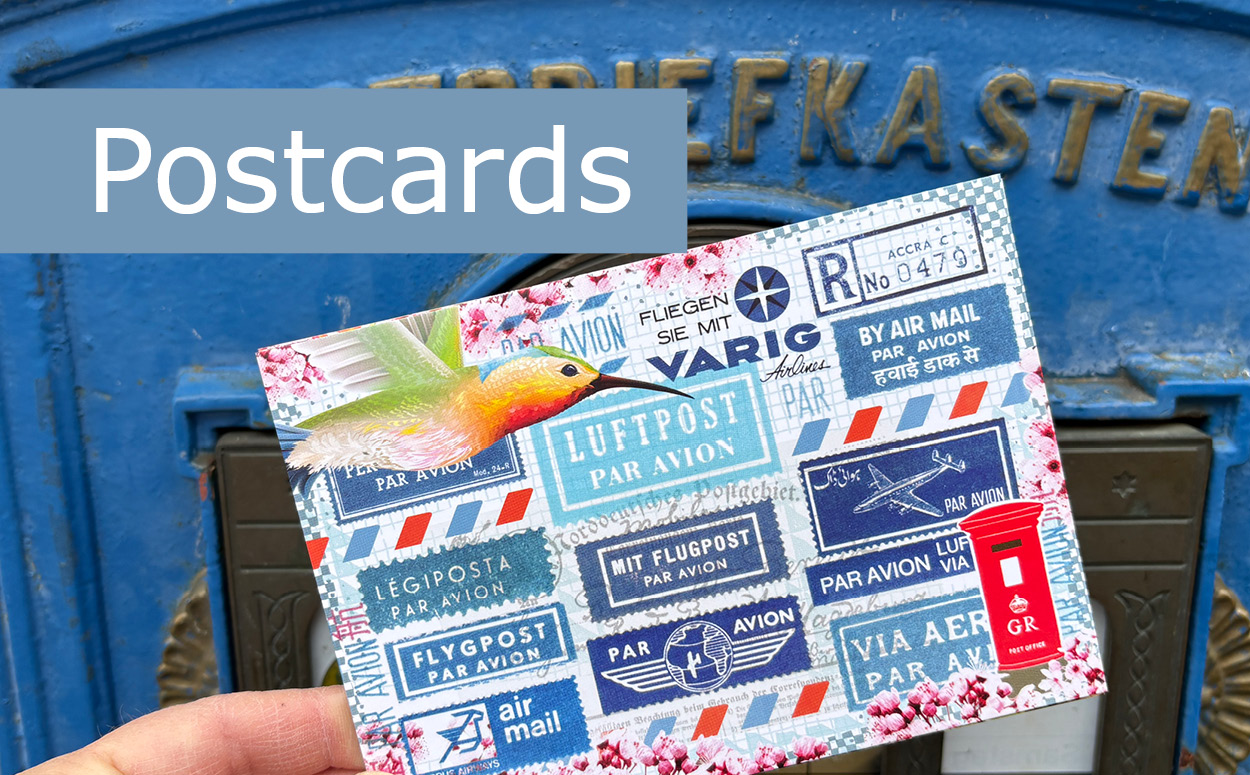 Postcards and rubberstamps with wooden handles, locally produced in Germany.