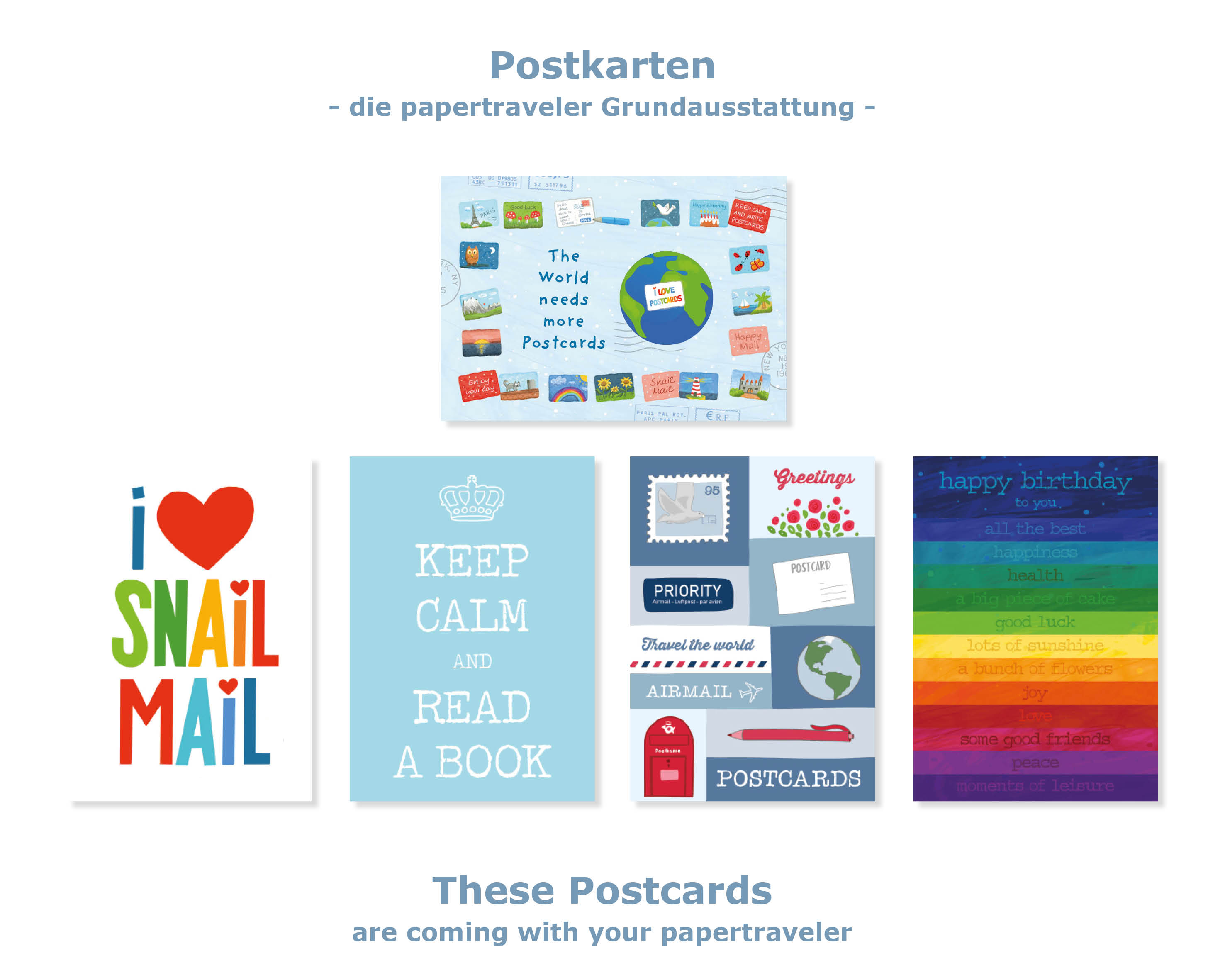 Zu Deinem papertraveler in der gewünschten Farbe erhältst Du jede Menge Zubehör: ein farbiges Gummiband zum Verschließen, 5 papersisters Postkarten, einen passenden papersisters Kugelschreiber oder Gelschreiber (je nach Vorrat) und 10 Airmail Aufkleber. Geliefert wird der papertraveler in einem passenden Stoffbeutel.