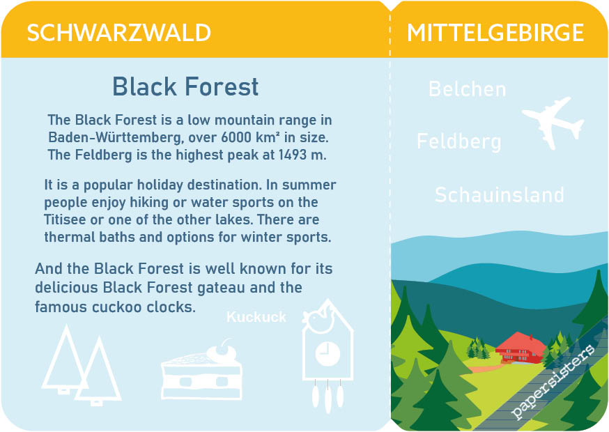 Der Schwarzwald ist eine beliebte Urlaubsregion, sowohl im Sommer als auch im Winter. Der Feldberg ist der höchste Punkt mit 1493 Metern Höhe. Weltberühmt sind die Schwarzwälder Kirschtorte und Kuckucksuhren.
